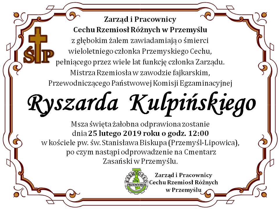 Z głębokim żalem i smutkiem przyjęliśmy wiadomość o śmierci Ryszarda Kulpińskiego nieodżałowanego mistrza cechu fajkarskiego. Ryszard Kulpiński był jednym z najznamienitszych twórców fajek. Ciągle trudno nam się z tym pogodzić bo mamy w pamięci spotkania z mistrzem w jego pracowni lub podczas spotkań miłośników fajki przy okazji mistrzostw. Odszedł człowiek mądry, uczciwy i szlachetny. W tym, czym się zajmował przez całe swoje pracowite życie, w tworzeniu fajek był perfekcyjnym fachowcem i artystą. Posiadał wiedzę i doświadczenie a co najważniejsze wielki talent, dzięki któremu stał się autorytetem dla młodszych pokoleń twórców fajek. Jego piękne dzieła, fajki zdobią nie tylko nasze kolekcje ale również mają już od lat swoje zasłużone miejsce w Przemyskim Muzeum Fajek i Dzwonów. W ostatniej drodze towarzyszyli mistrzowi Ryszardowi przedstawiciele społeczności miłośników fajek skupionych w klubach należących do Rady Polskich Klubów Fajki. Niełatwo znaleźć słowa pociechy w tych trudnych dniach, ale pragniemy jednak życzyć rodzinie mistrza Ryszarda Kulpińskiego dużo sił do zniesienia bólu i wyrazić nadzieję, że czas złagodzi poczucie straty. Przekazujemy od nas wyrazy szczerego współczucia.