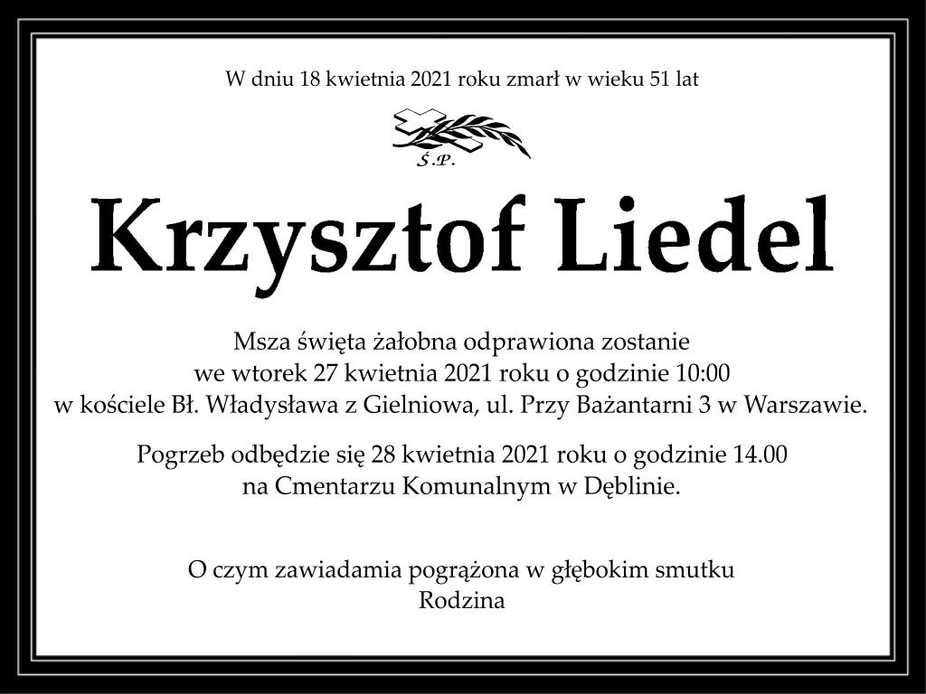 Poniżej zamieszczam informacje o uroczystości pogrzebowej mojego Taty – Krzysztofa Liedela.