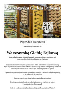 Pipe Club Warszawa ma zaszczyt zaprosić na Warszawską Giełdę Fajkową, która odbędzie się w dniu 30. listopada 2025, od godzimy 12-tej do 17-tej w warszawskim Gnieździe Piratów, ul. Ogólna 5.